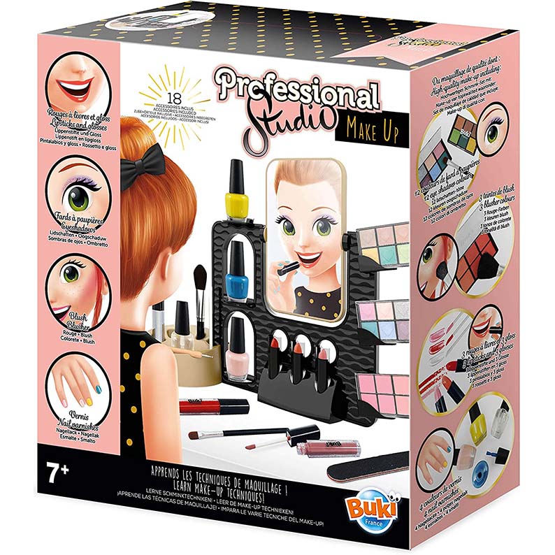Impara le migliori tecniche di trucco grazie al libretto e allenati nel tuo studio! Affidati al libretto per scoprire quale colore, quale texture e quali abbinamenti si addicono di più alla forma del tuo viso o al colore dei tuoi capelli! 1 specchio e numerosi cassetti/scomparti per riordinare tutto: limetta per le unghie, 2 pennelli, 1 dotter per fare puntini sulle unghie e uno spingicuticole. Trucchi di qualità inclusi: 4 smalti, 3 gloss, 3 rossetti, 2 palette di ombretti 1 palette di blush. Libretto di istruzioni illustrato a colori. A partire da 7 anni.