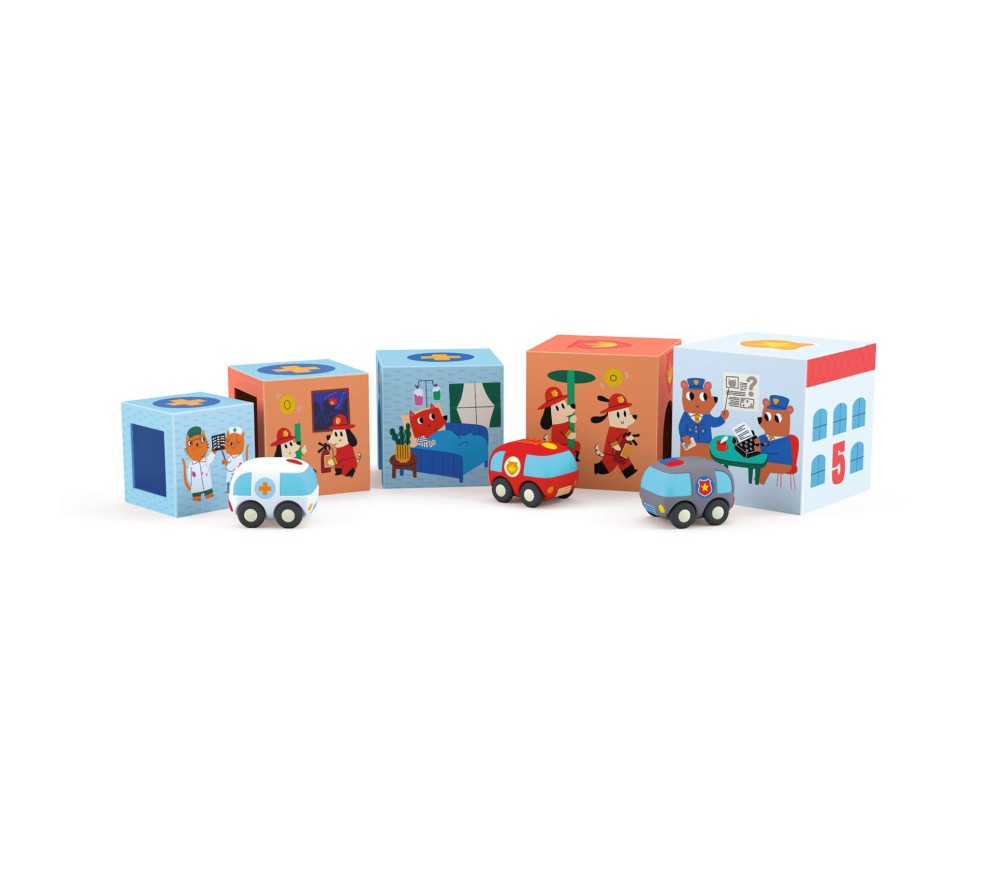 I cubi hanno illustrazioni su ogni lato che rappresentano un ospedale, una caserma e un commissariato, nonchè i numeri da 1 a 5, con oggetti da contare e dettagli da scoprire.