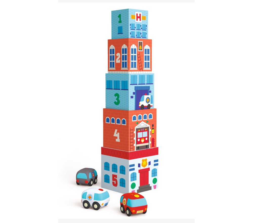 Un divertente set di 5 blocchi colorati, in robusto cartone, da impilare o infilare uno dentro l'altro, creando scenari sempre diversi per i veicoli (ambulanza, pompieri, polizia, in morbida plastica) compresi nella confezione.