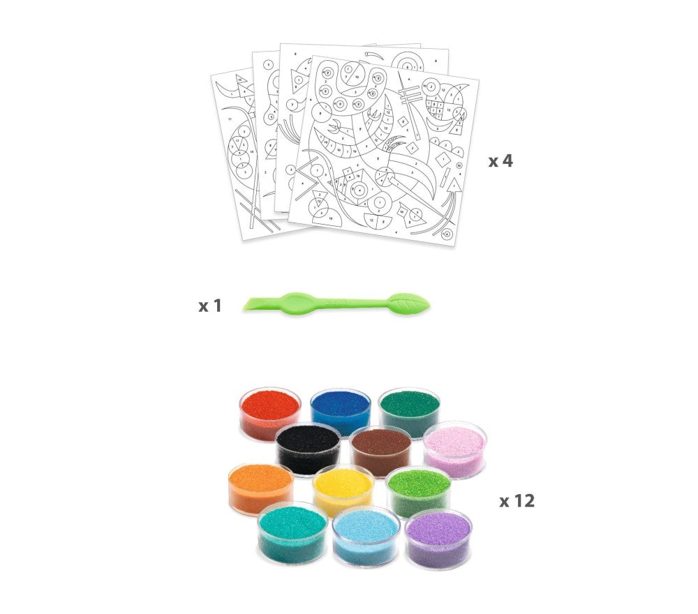 4 carte illustrate (20 x 20 cm), 12 vasetti di sabbie colorate, 1 strumento in plastica, 1 libretto a colori con le istruzioni punto per punto.