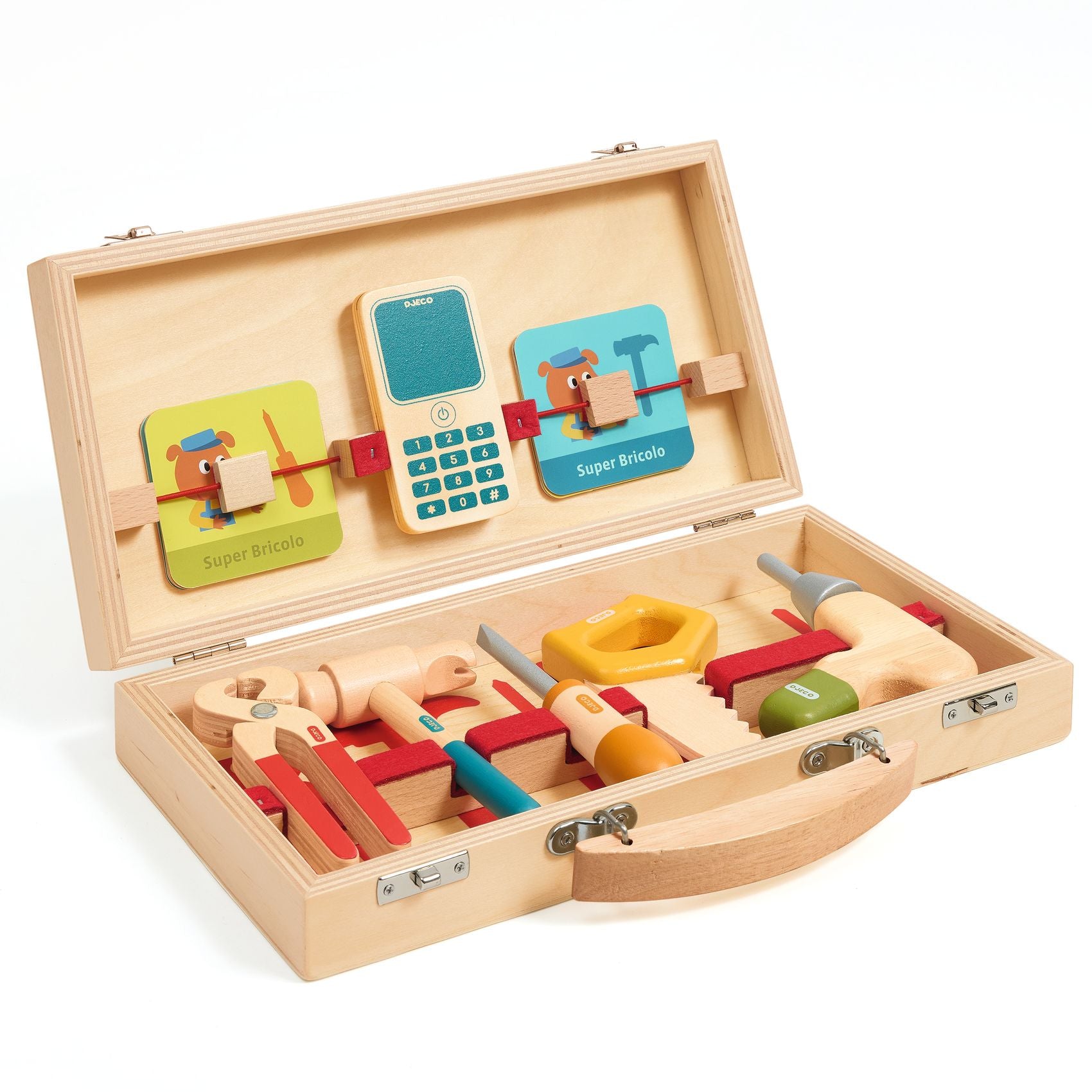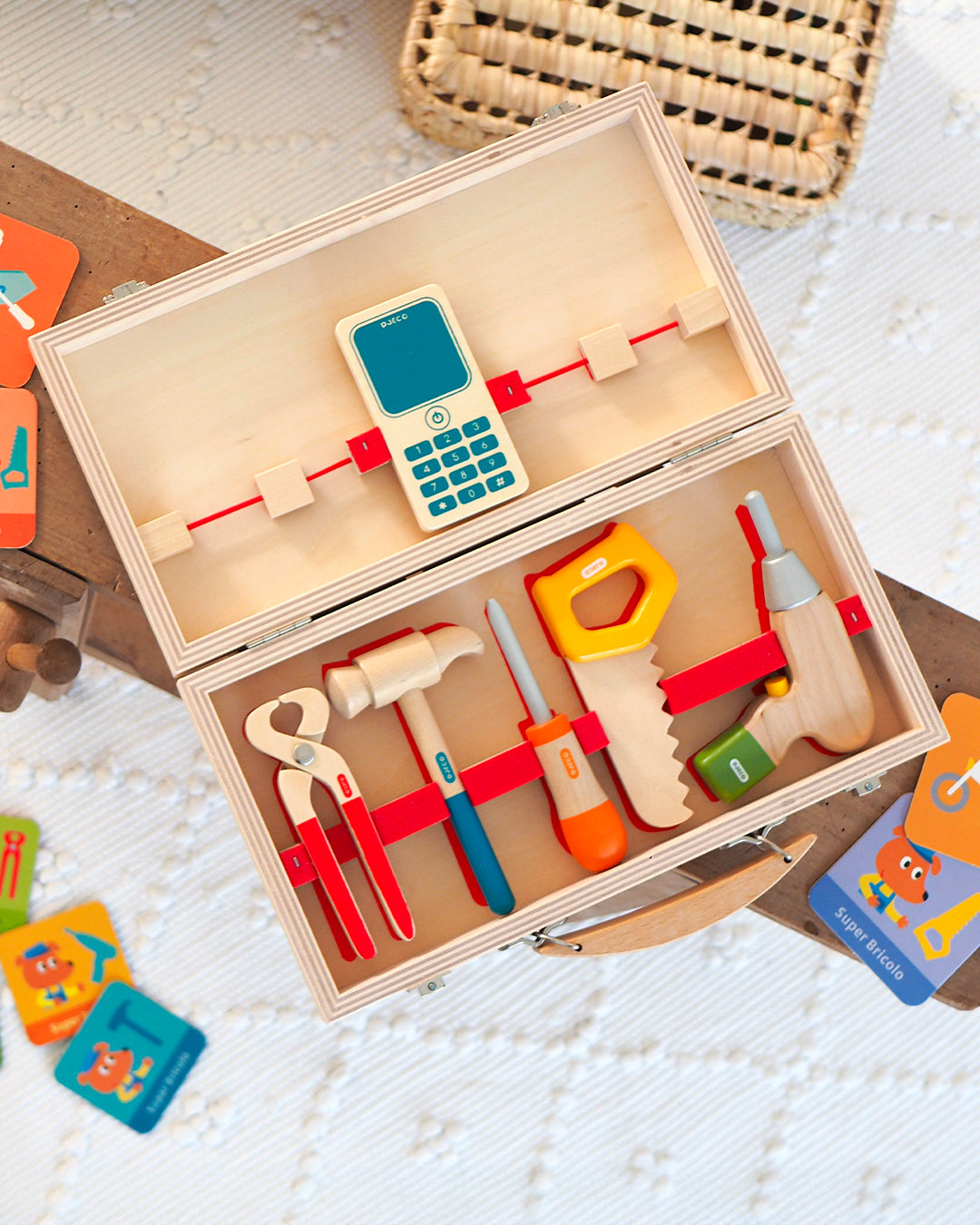 Una cassetta degli attrezzi in legno che include un martello, una sega, un giravite, un trapano, una pinza e otto carte da sistemare con cura e organizzazione. Le carte associano una situazione allo strumento giusto che Super Bricolo deve utilizzare per realizzare la riparazione. Un gioco di imitazione per imparare tante cose.