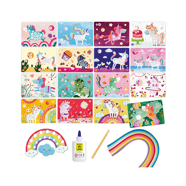 Decoro con la Carta è un divertente gioco creativo che permette ai bambini di decorare magici unicorni con tanti riccioli di carta multicolore. Questo gioco introduce i bambini alla quilling art, un'originale tecnica artistica che consiste nell'arrotolare strisce di carta colorata e incollarle sulle immagini per creare splendide decorazioni. Nella scatola è incluso tutto l'occorrente per sperimentare questa tecnica e un manuale di istruzioni che insegna passo passo come realizzare le opere d'arte.