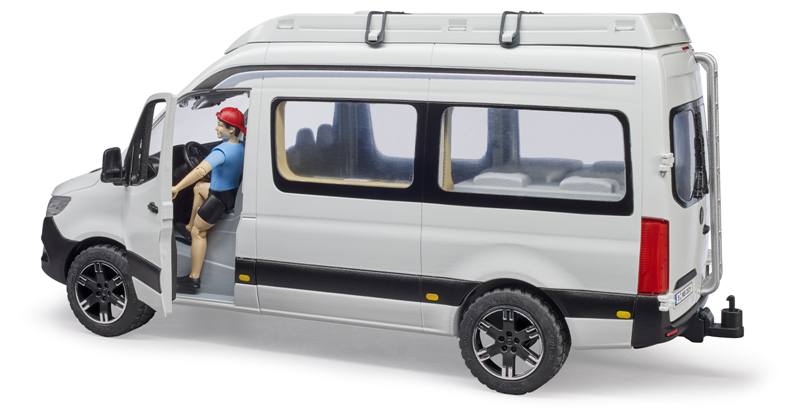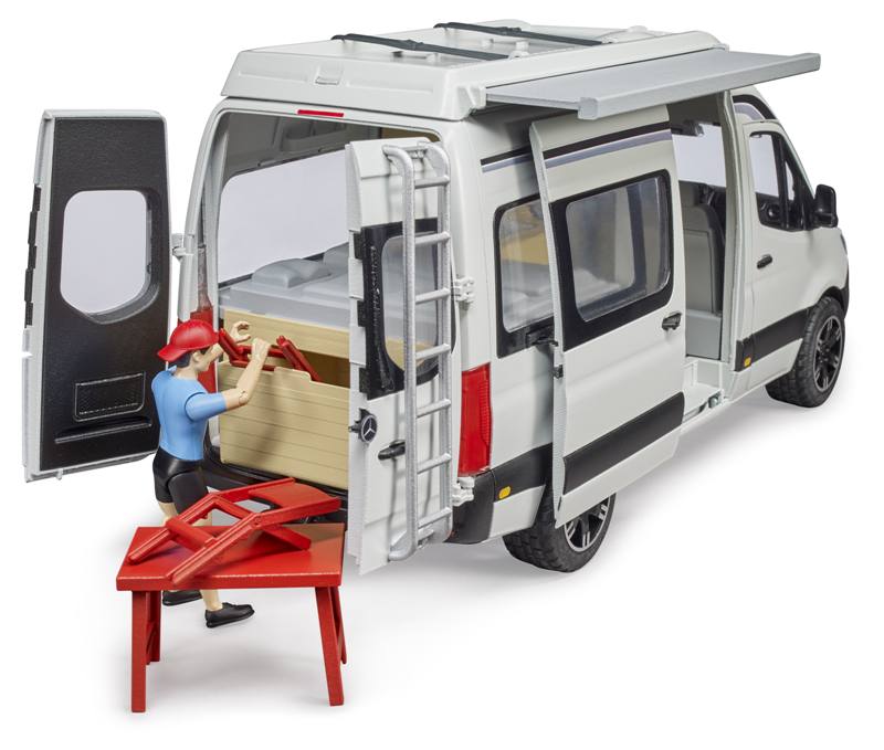 Il campeggio è di tendenza. A livello europeo, le immatricolazioni dei veicoli da campeggio 2018 e 2019 hanno raggiunto nuovi livelli record. Anche i più piccoli possono vivere questo entusiasmante tema per il tempo libero, con BRUDER! Il nuovo MB Sprinter ha riscosso un grande successo anche come modello base per i camper. La versione del nuovo MB Sprinter Camper di BRUDER colpisce per i suoi dettagli e la sua versatilità. Il veicolo è dotato di portiere apribili sulla cabina di guida e sulla parte posteriore. Qui il personaggio bworld in dotazione ha accesso al letto matrimoniale integrato e all'ampio scomparto. Una caratteristica speciale è rappresentata dalla porta scorrevole di nuova concezione sul lato passeggero, che consente di raggiungere la cucina. Per le giornate di sole, il camper dispone di una tenda parasole estraibile, nonché di mobili e stoviglie da campeggio in stile. Fantastici complementi per il camper sono il kayak bworld (n. art. 63155), trasportabile sul tetto, nonché la mountain bike bworld (n. art. 63111) e la bici da corsa bworld (n. art. 63110).