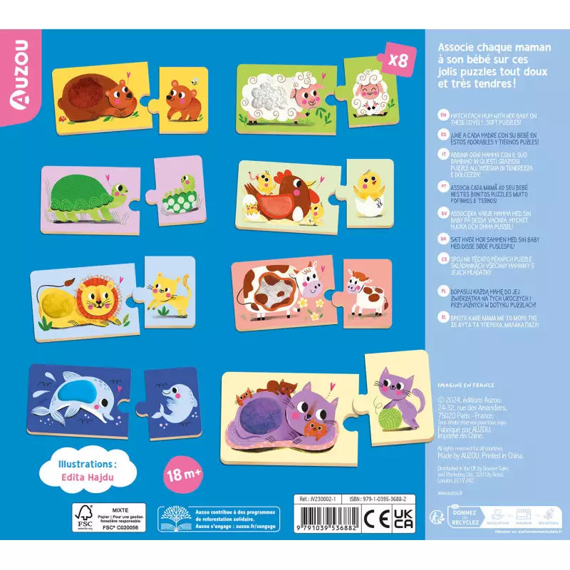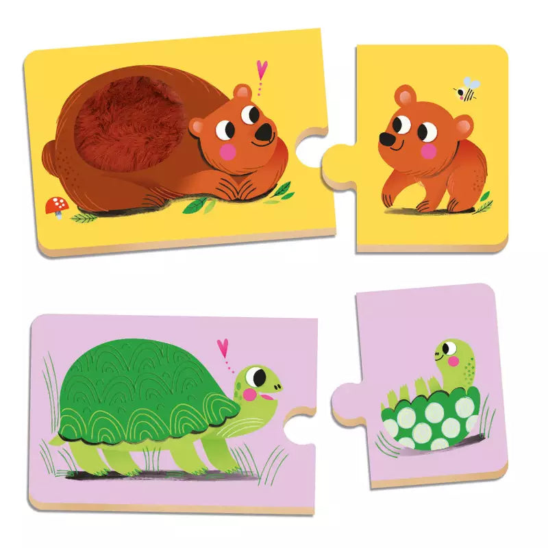 8 puzzle da 2 pezzi: il bambino associa un animale adulto al suo cucciolo. I puzzle duo offrono 8 materiali da toccare per risvegliare i sensi dei più piccoli. Un'attività che promuove le capacità motorie, la pazienza e la consapevolezza sensoriale.
