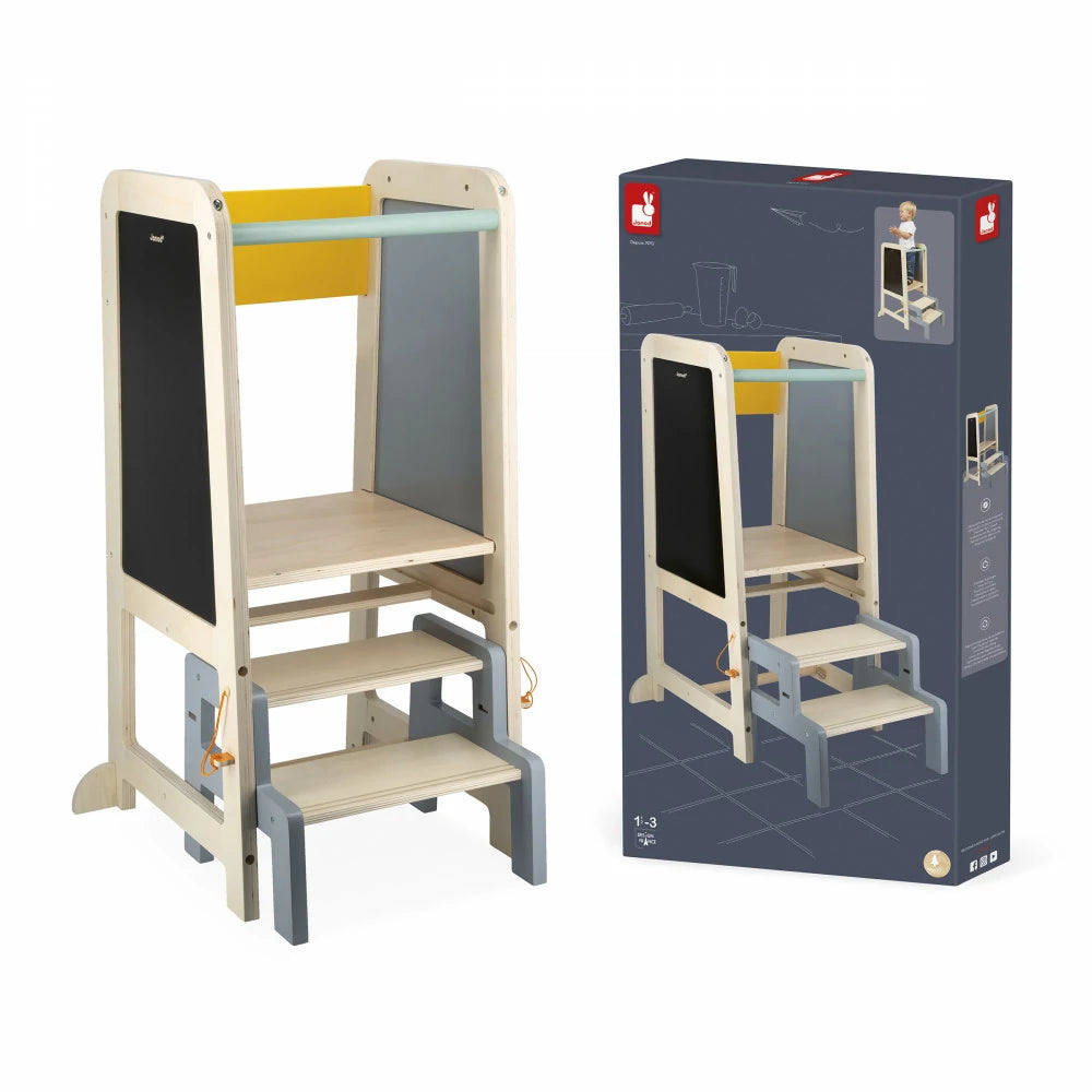 Per diventare autonomi come i grandi! Questa torre di osservazione in legno, adatta ai bambini dai 18 mesi in su, è ideale per acquisire l'indipendenza e la sicurezza necessarie per esplorare il mondo. Un torre di apprendimento ergonomica e funzionale, dotata anche di una lavagna in ardesia accompagnata da 2 gessetti e 1 cancellino! Questa torre di osservazione multifunzione conquisterà tutta la famiglia. I più piccoli potranno sviluppare le abilità motorie, diventare sempre più autonomi e divertirsi a disegnare con questa torre di apprendimento in legno! Per seguire il bambino durante la crescita e fino ai 3 anni, questa torre di osservazione evolutiva è dotata di uno sgabello che si fissa ai lati della torre o può essere usato in modo indipendente. E per una maggiore adattabilità, questa torre di osservazione multiuso è variabile in altezza: sono disponibili 2 livelli (32,5 cm e 40,5 cm) facili da regolare! Lo spessore del legno rende questa torre di osservazione un giocattolo multisensoriale robusto e sicuro per i bambini. Grazie al suo stile classico e alle forme arrotondate, questa torre di apprendimento per bambini può essere installata in tutti i punti strategici della casa, come la cucina o il lavandino. Pratico e pedagogico, questo mobile evita la frustrazione dei più piccoli che non riescono a raggiungere il tavolo o il piano di lavoro, consentendo loro di partecipare alle attività quotidiane. La torre è perfetta per non sentirsi esclusi e stimolare la curiosità: i bambini potranno esplorare ciò che li circonda in totale sicurezza! Dopo essere salito sulla torre di apprendimento, il bambino avrà le mani libere... E anche i suoi genitori!