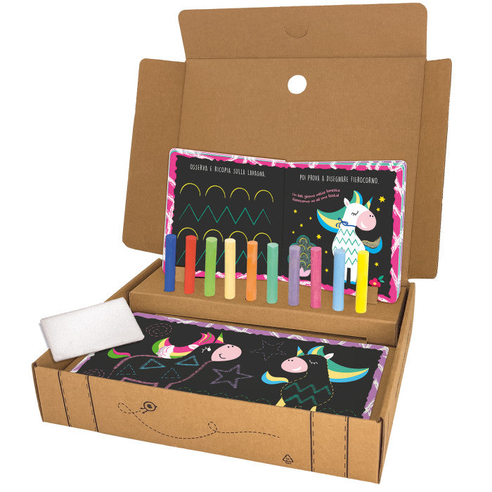 • In una valigetta da portare sempre con sé sono contenuti un libro e un set di lavagnette scrivi e cancella e 10 gessetti colorati per divertirsi, imparando a tracciare le prime linee.