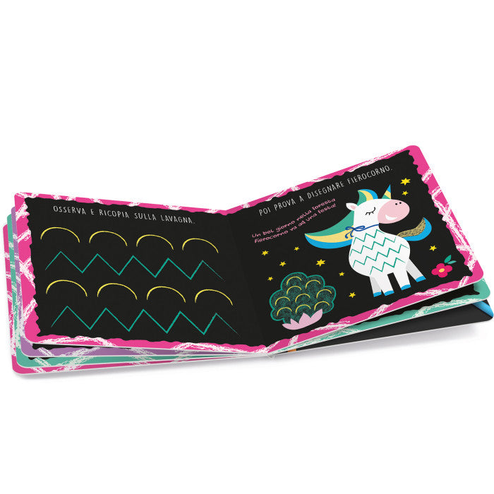 • Facciamo zig-zag tra gli unicorni! C’è l’unicorno Minù che vola tra i riccioli nel cielo blu: riuscirai a tracciarli sulla lavagnetta?
