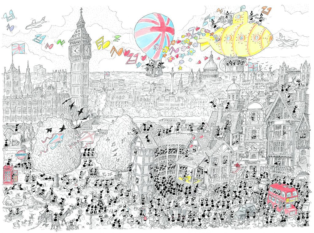 Rappresentazione prevalentemente in bianco e nero della città di londra, con qualche eccezione colorata per elementi caratteristici del luogo: le cabine telefoniche rigorosamente di colore rosso, il famoso “Yellow Submarine“ dei mitici Beatles e naturalmente non potevano mancare i colori della bandiera nazionale.