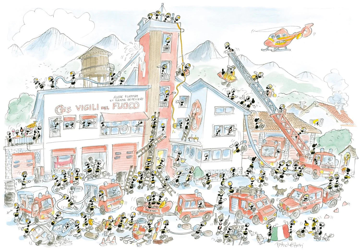 I pompieri sono tra i migliori amici della gente: ci difendono dal fuoco, ci soccorrono quando siamo in pericolo e, nel mentre, fanno di tutto per tutelare il nostro patrimonio artistico. Fabio Vettori li ha spesso omaggiati dedicandoli tante sue opere per il gran lavoro che fanno. In questo caso abbiamo un simpatico paesaggio delle formiche in tenuta da vigili del fuoco, che ci mostrano la routine di questi eroi.